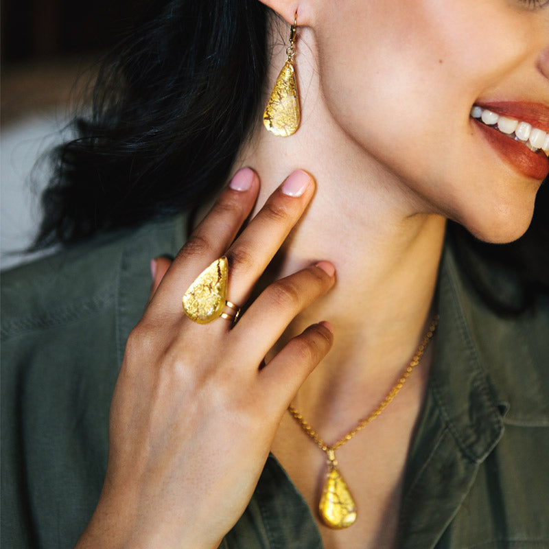 Découvrez notre superbe bague de créateur en véritable verre de Murano. La partie en verre à l’authentique feuille d'or 24 carats est entièrement réalisée à la main par nos artisans verriers d'exception à Murano. Chaque pièce est une œuvre d'art. Notre bague de créateur made in France, allie les savoir-faire traditionnels et la modernité de l'élégance française.